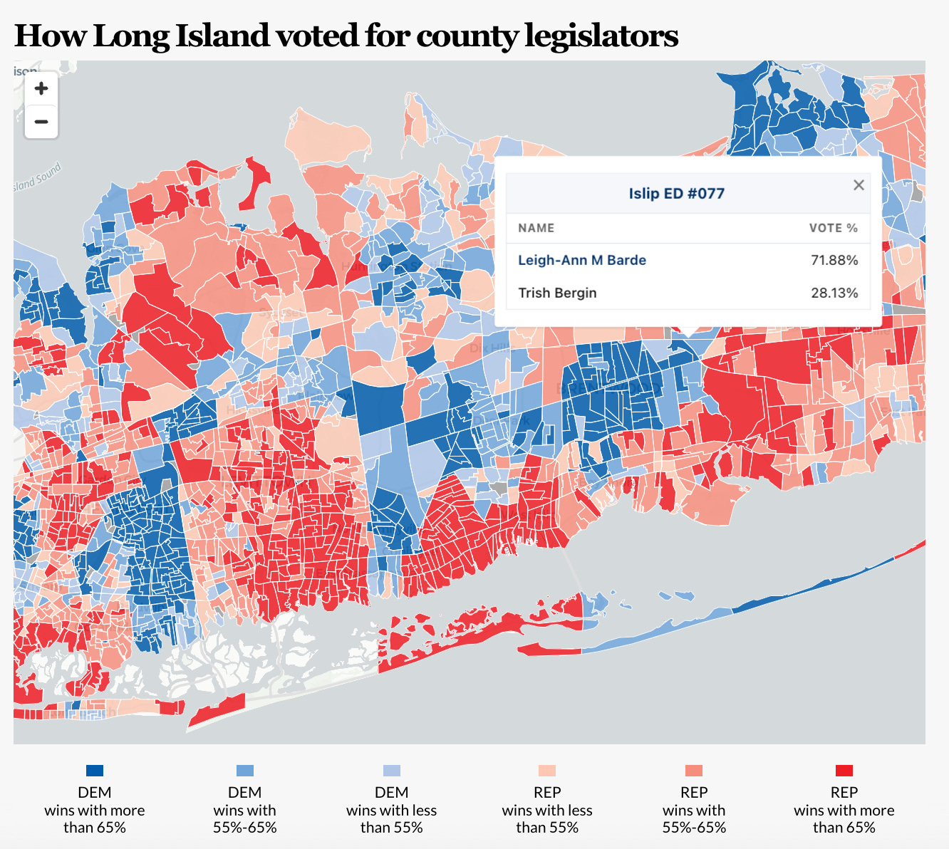 Nassau still hadn’t confirmed some of their local races. It took a whole extra day to receive Nassau’s election results by race and district, in mangled raw ASCII format no less. Here’s the finished map we published on Newsday!